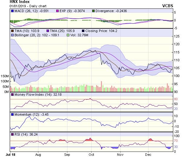Tuy nhiên, chỉ số vẫn đang đóng cửa dưới MA20, kèm chỉ báo ADX đi lên vùng 25 và đường +DI nằm dưới –DI cho thấy xu hướng chính trong ngắn hạn vẫn là giảm điểm, phiên tăng điểm vừa qua có thể chỉ nằm trong một nhịp hồi kỹ thuật, vùng kháng cự gần có thể là vùng 105.5 điểm (MA20).