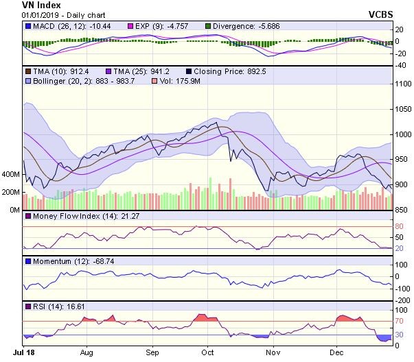Nếu thị trường không thể vượt qua được vùng kháng cự trên trong những phiên đầu tiên của năm 2019, thì chúng tôi phải cảnh báo khả năng thị trường sẽ tiếp tục giảm về vùng hỗ trợ mạnh hơn nằm tại 860-870 điểm, trước khi cho tín hiệu rõ ràng hơn về một đợt hồi phục tăng điểm trở lại.