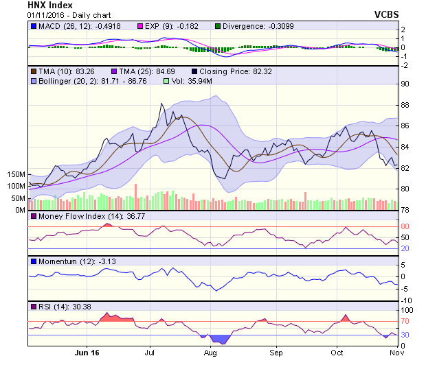 Chỉ số kết phiên ở dưới đường MA20 (84,2 điểm) và MA50 (84 điểm) nên xu hướng trong trung hạn của HNX-Index ở mức tiêu cực, với kháng cự tại 84 điểm. Dự báo xu hướng của HNX-Index trong phiên 2/11 có thể là tăng điểm để thử thách mốc hỗ trợ tại 82,5 điểm. Nếu mốc này không bị vượt qua, chỉ số sẽ dao động trong khoảng 81,8-82,5 điểm.