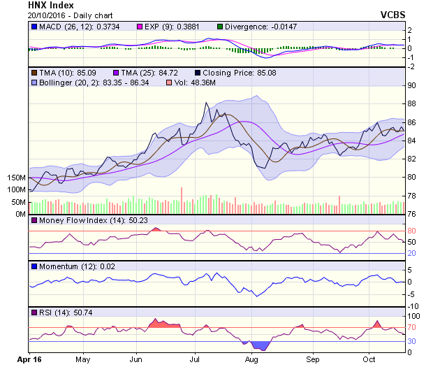 Trong trung hạn, xu hướng của HNX-Index là tích cực với ngưỡng hỗ trợ gần nhất là MA20 (84,8 điểm) và xa hơn là MA50 (84,1 điểm). Dự báo xu hướng trong phiên 21/10 của HNX-Index có thể là lui về kiểm tra lại mốc hỗ trợ tại 84,8 điểm. Nếu mốc này giữ vững, chỉ số sẽ dao động trong khoảng 84,8-86 điểm.