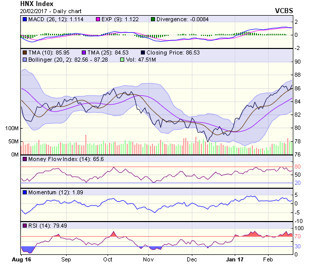 HNX-Index có phiên tăng điểm thứ 2 liên tiếp. Tín hiệu kỹ thuật trong ngắn hạn chuyển từ trung tính lên tích cực, với vùng hỗ trợ trong khoảng 85,9-86,1 điểm (MA5-10) và kháng cự gần nhất tại 86,7 điểm (đỉnh phiên 15/2). Tín hiệu kỹ thuật trong trung hạn duy trì tích cực, với hỗ trợ gần nhất tại 84,9 điểm (MA20).