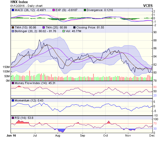 HNX-Index tăng điểm mạnh, tạo thành một nến xanh khá bullish với phần bóng trên dài, thể hiện áp lực chốt lời ở vùng giá cao là khá mạnh mẽ. Với phiên tăng điểm này, tín hiệu trong ngắn hạn chuyển từ trung tính sang tích cực, với vùng hỗ trợ trong khoảng 80,7-80,8 điểm (MA5-10). Xu hướng trong trung hạn chuyển từ tiêu cực sang trung tính, với hỗ trợ tại 80,9 điểm (MA20) và kháng cự tại 82,8 điểm (MA50). HNX-Index tiếp tục ở trong bear market, với kháng cự tại MA200 ở mức 82,4 điểm. Dự đoán trong phiên 2/12, HNX-Index sẽ dao động trong biên độ 80,9-82,4 điểm.