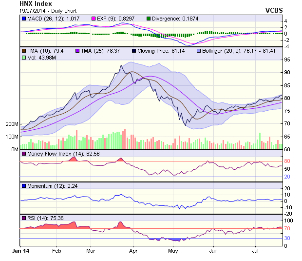 Tăng điểm nhẹ trong phiên giao dịch cuối tuần, HNX-Index tăng thêm 0,3 điểm lên 81,14 điểm. Tính từ khoảng tháng 5/2014 trở lại đây HNX-Index đã có nhịp tăng điểm khá tích cực. Tuy nhiên phương diện kỹ thuật chủ yếu vẫn dao động khá yếu và không cho tín hiệu mua vào mạnh mẽ. SO giằng co quanh đường tín hiệu, cùng MACD dao động trong biên độ hẹp. Các phiên tới, HNX-Index chủ yếu sẽ dao động quanh vùng 81 điểm.