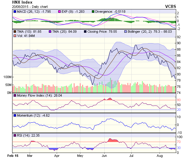Đồ thị HNX-Index sau 2 phiên nỗ lực phục hồi nhưng không bứt phá được khỏi mốc cản 80 điểm đã suy yếu mạnh tạo thành 1 marubozu cho thấy áp lực bán diễn ra mạnh. Chỉ số này sẽ sớm kiểm định lại mốc hỗ trợ 76 điểm trong các phiên giao dịch tới. Các chỉ báo kỹ thuật cho thấy áp lực điều chỉnh đang tiếp tục duy trì và chưa có dấu hiệu của việc đảo chiều tăng điểm sẽ quay trở lại.