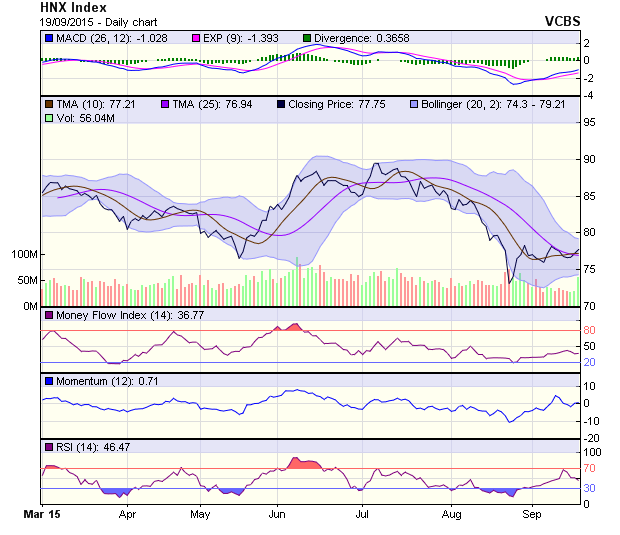 Đồ thị tuần của HNX-Index tạo thành doji và tiếp tục dao động tích lũy quanh vùng 76.5–78.3 điểm. Mốc cản 78.3 điểm quyết định cho trạng thái giao dịch của chỉ số này trong các phiên tuần tới. Đồ thị ngày cho thấy trạng thái bật tăng khá tích cực sau khi chạm ngưỡng hỗ trợ 76 điểm.