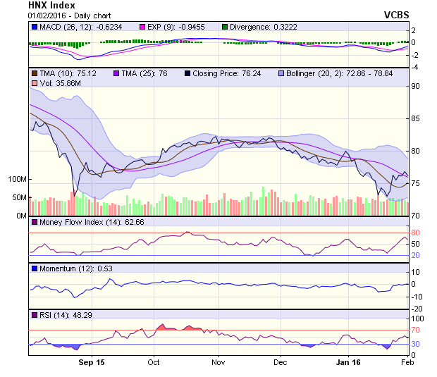 HNX-Index cũng giảm điểm trở lại, tuy nhiên vẫn tiếp tục nằm trên mốc hỗ trợ ngắn hạn là đường MA20. Trạng thái giằng co nhiều khả năng tiếp tục diễn ra trong các phiên còn lại khi mà dòng tiền có có xu hướng suy yếu trước Tết Nguyên Đán. Ngưỡng kháng cự tiếp theo là đường MA50, tương đương mức 78,13 điểm.