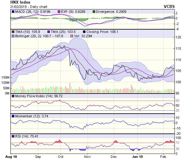 HNX-Index có diễn biến trái chiều, khi chỉ số có phiên giảm điểm trở lại. Mặc dù vậy, chỉ số vẫn đang đóng cửa trên MA20, kèm theo đường ADX đi lên vùng 20 và đường +DI nằm trên –DI, cho thấy xu hướng phục hồi vẫn còn,