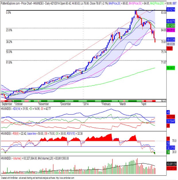 Chỉ số HNX-Index đã giảm qua ngưỡng hỗ trợ 79-80 điểm. Diễn biến giằng co tại vùng hỗ trợ trong phiên không rõ rệt, cho thấy áp lực cung vẫn chiếm ưu thế. Ngưỡng hỗ trợ mạnh hơn đối với HNX-Index là khoảng 76 điểm.