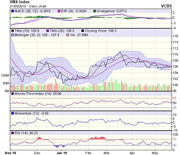 HNX-Index cũng có diễn biến tương tự. Mặc dù, chỉ số có phiên giảm điểm trở lại nhưng vẫn đang đóng cửa trên MA20, cho thấy cơ hội quay lại xu hướng phục hồi của chỉ số là vẫn còn, trong trường hợp tích cực, chỉ số có thể đi lên trở lại thử thách vùng 107-107,3 điểm (MA50 – MA100).