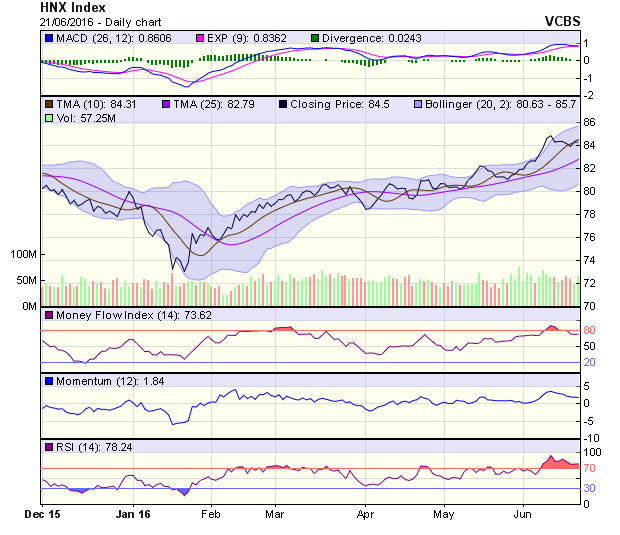 HNX-Index hình thành cây nến xanh hammer, lực mua tích cực quay lại vào cuối phiên. Rủi ro trong ngắn hạn vẫn có thể diễn ra khi RSI hiện đã nằm trong vùng overbought được 2 tuần, MACD chưa cho tín hiệu tăng mạnh trở lại. Vùng hỗ trợ 83,5 điểm. Vùng kháng cự 85 điểm.