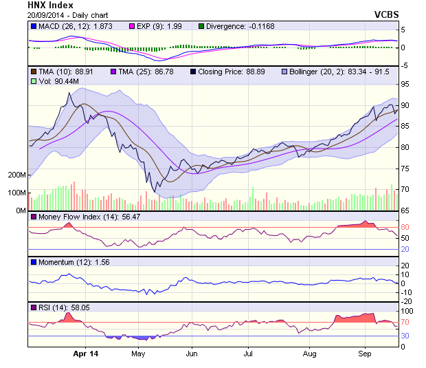 Bên cạnh đó khối lượng giao dịch giảm sút cũng diễn tả dòng tiền vào lại chưa mạnh. Tuy nhiên, xu hướng tăng trung hạn của HNX-Index vẫn đang được duy trì với ngưỡng hỗ trợ quanh 86 điểm (tương ứng MA 26). Các chỉ báo kỹ thuật đang dần xấu đi, RSI hình thành mô hình 2 đỉnh đang đi xuống, đường cỏ MACD đã bắt đầu mọc dưới đường 0. Các tín hiệu này đang ảnh hưởng đến đà tăng của đường giá trong các phiên tiếp theo.