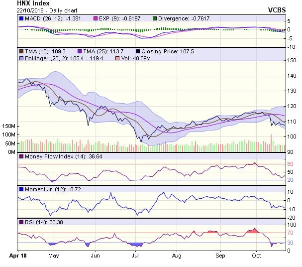 HNX-Index có diễn biến tương tự. Chỉ số tiếp tục đóng cửa dưới MA5 và 20, cho thấy xu hướng điều chỉnh ngắn hạn đang tiếp diễn, chỉ số có thể suy giảm về thử thách vùng 103 điểm (Fib 100).