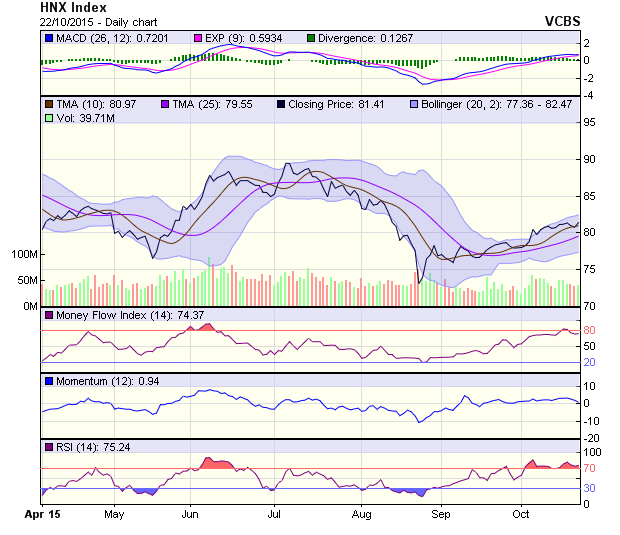 HNX-Index vẫn đang duy trì khá tốt xu hướng tăng điểm, đồng thời được kỳ vọng sẽ tiến đến thử thách vùng kháng cự mạnh 82,5-83 điểm trong ngắn hạn. Tuy nhiên, chỉ số này có thể cũng sẽ cần thêm một vài phiên điều chỉnh tích lũy quanh ngưỡng cản 81 điểm, trước khi tiếp tục xu hướng tăng điểm trong thời gian tới.