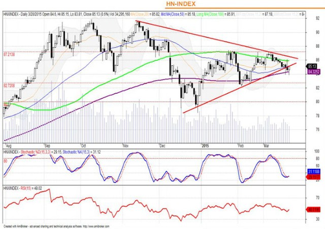 Đường giá chỉ số HNX-Index hiện vẫn được giữ trên đường hỗ trợ SMA200, do vậy xu hướng giảm vẫn chưa được khẳng định. Tuy vậy, nếu tiếp tục giảm, chỉ số này sẽ test lại mốc 82,7 điểm trong các phiên tới. Các tín hiệu kỹ thuật cũng cho tín hiệu tích cực với Stochastic tăng trở lại v̀à RSI cũng đã tăng lại sau khi giảm quá mốc 50.