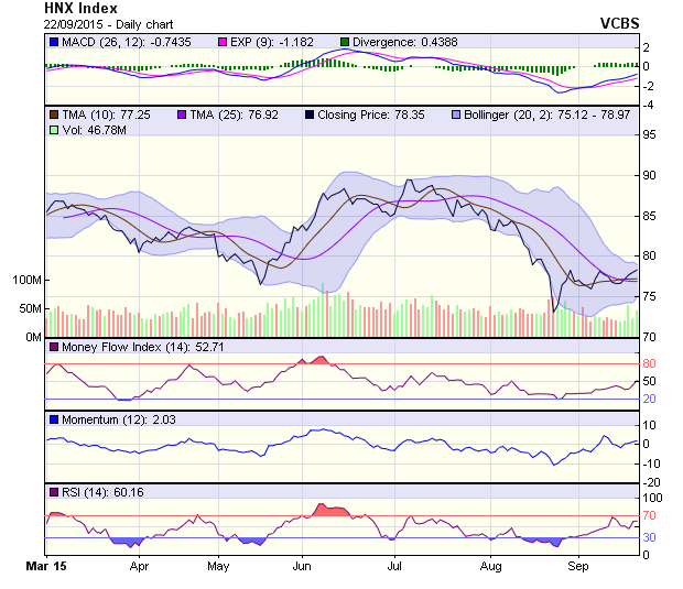 Đồ thị chỉ số HNX-Index duy trì phiên tăng liên tục thứ 4 liên tiếp và hiện tại đã break thành công mốc cản 78 điểm. Tuy vậy, mô hình Ascending Triangle không chắc chắn do lượng giao dịch không có sự đột biến và đà tăng không tạo thành mức tăng tích cực. Các chỉ báo kỹ thuật cũng duy trì đà tăng tích cực trong giai đoạn này cho dấu hiệu tích cực về trạng thái tích lũy của HNX-Index trong giai đoạn này