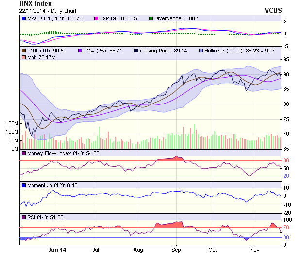 HNX-Index liên tục có những phiên biến động mạnh trong các ngày gần đây. Ở phiên 21/11 là sự biến động mạnh theo chiều giảm. Toàn bộ thành quả tăng giá có ở phiên trước đã bị đánh mất, đường giá trở lại sát mức MA trung hạn.