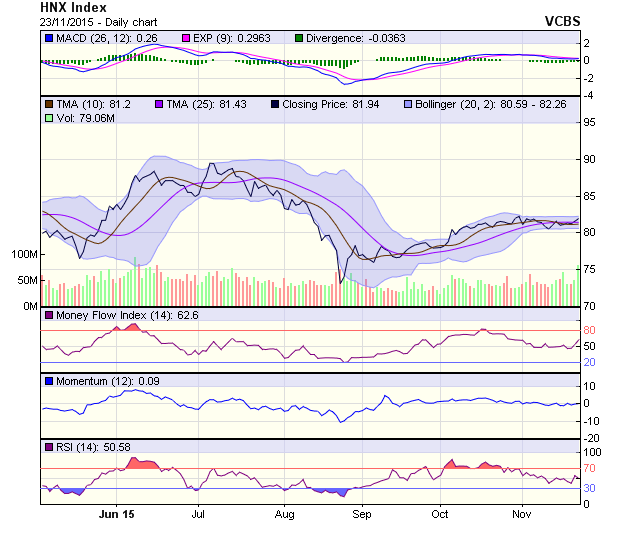 Ngược lại, HNX-Index đóng cửa phiên đầu tuần 23/11 bằng mức tăng nhẹ 0.35 điểm lên đứng ở mức 81.94 điểm. Với phiên hồi phục thứ 2 liên tiếp, chỉ số này mặc dù vẫn nằm dưới ngưỡng cản 82 điểm, nhưng những tín hiệu phát đi từ đồ thị kỹ thuật là khá lạc quan nhờ có sự đồng thuận của thanh khoản. Khối lượng giao dịch phiên 23/11 tăng khá tốt (+18%) so với phiên cuối tuần trước và vượt xa mức bình quân 22 phiên gần nhất (39.4 triệu cổ phiếu/phiên).