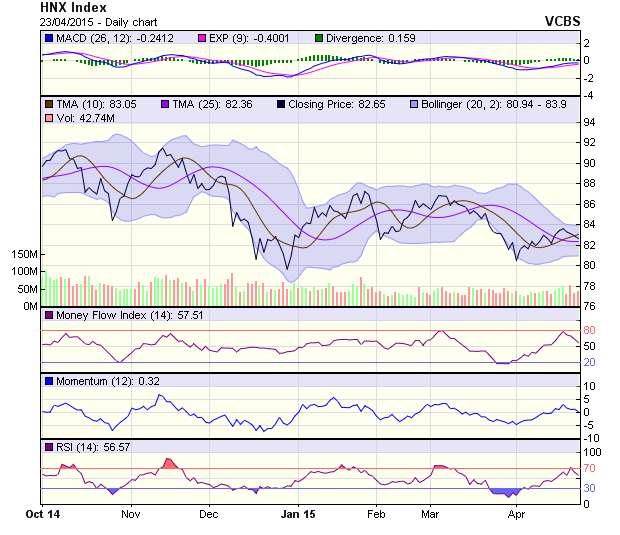 HNX-Index tạo thành 1 Doji với thân ngắn và đuôi nến khá dài. Điều này cho thấy chỉ số này đang phản ứng khá tích cực với mốc hỗ trợ 82.5 điểm. Nếu tiếp tục giảm xuống dưới mốc này, nhiều khả năng chỉ số sẽ test lại mốc 81.5 điểm. Các chỉ báo kỹ thuật tiếp tục cho dấu hiệu suy yếu sau 4 phiên liên tiếp điều chỉnh. Đường Stochastic đang tiếp tục giảm từ vùng Overbought. Đường RSI cũng đang giảm về ngưỡng 45.