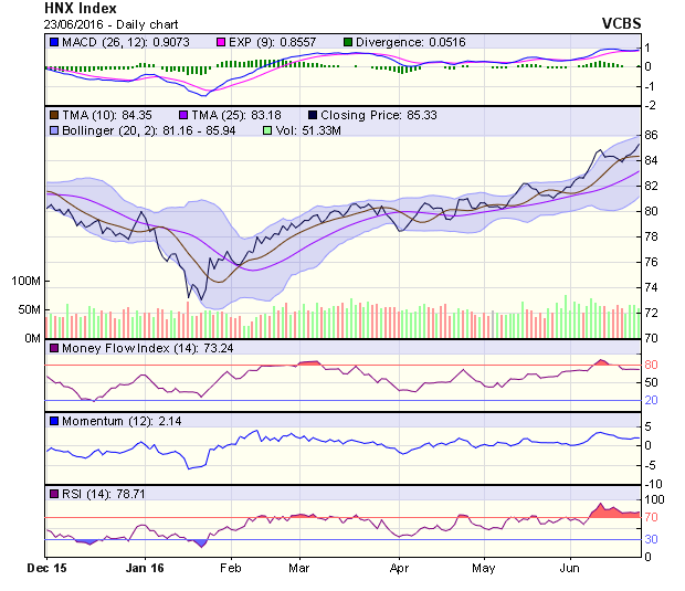 HNX-Index hình thành cây nến marubozu, vượt ngưỡng kháng cự 85 điểm. RSI hiện đang nằm trong vùng overbought, MACD cho tín hiệu tăng trở lại trong ngắn hạn. Vùng hỗ trợ 83,5 điểm.