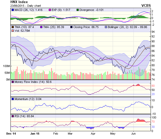 Đồ thị chỉ số HNX-Index tiếp tục trạng thái giao dịch tích lũy đi ngang quanh vùng 87.3 – 88 điểm. Lượng giao dịch giảm cho thấy xu hướng thận trọng của dòng tiền tiếp tục dâng cao. Các chỉ báo kỹ thuật không cho tín hiệu tích cực trong ngắn hạn.