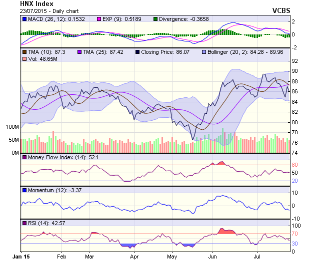 Đồ thị chỉ số HNX-Index tạo thành một nến đen dài cho thấy xu hướng điều chỉnh giảm vẫn chưa chấm dứt. Mốc cản trong ngắn hạn tương ứng với đường SMA20 sẽ xác định sự đảo điều xu hướng trong ngắn hạn. Nếu phá vỡ mốc cản này, chỉ số sẽ test lại mốc 90 điểm. Các chỉ báo kỹ thuật cho thấy đà điều chỉnh trong ngắn hạn chưa có dấu hiệu suy yếu.