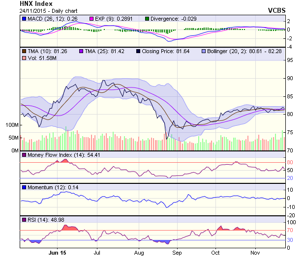 HNX-Index điều chỉnh giảm nhẹ và hiện vẫn nằm bên trên trendline tăng điểm ngắn hạn. Đường SMA20 cũng đang hỗ trợ khá tốt cho chỉ số này. Tuy nhiên, đường SMA200 phía trên, tương ứng mốc 82.5 điểm đang tỏ ra là ngưỡng kháng cự mạnh khi HNX-Index lần thứ 2 liên tiếp trong 1 tháng test không thành công mốc cản này.