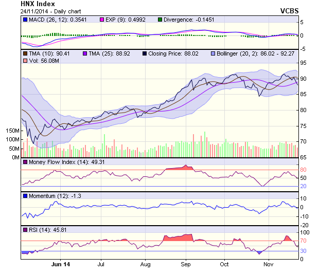 Dự báo khu vực 84-88 điểm sẽ rất nhạy cảm do có sự trung lặp của khá nhiều mốc hỗ trợ quan trọng đối với xu hướng ngắn và trung hạn. Nếu HNX-Index tiếp tục giảm mạnh và phá vỡ mốc 84 điểm thì cần thận trọng với khả năng thay đổi của xu hướng lớn từ tháng 5/2014 đến nay.