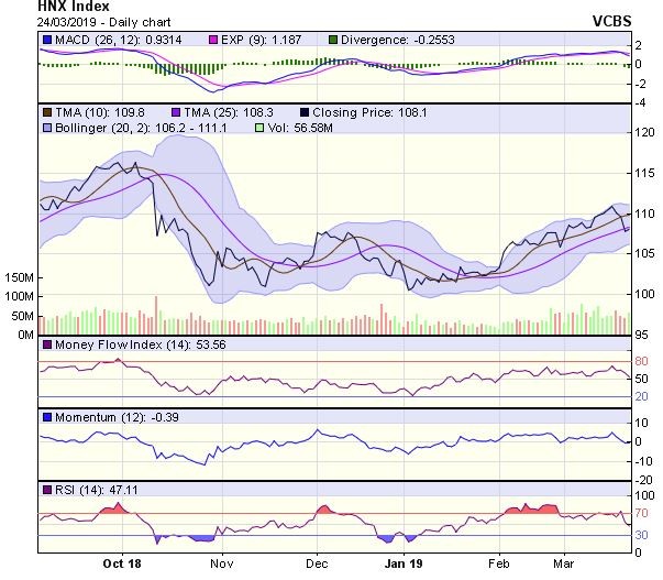 HNX-Index diễn biến tương tự. Mặc dù, chỉ số có phiên tăng điểm trở lại nhưng vẫn ở dưới MA20, kèm khối lượng giao dịch suy giảm cho thấy áp lực điều chỉnh ngắn hạn vẫn khá mạnh, chỉ số có thể suy giảm trở lại thử thách vùng 107,3 điểm (MA200).