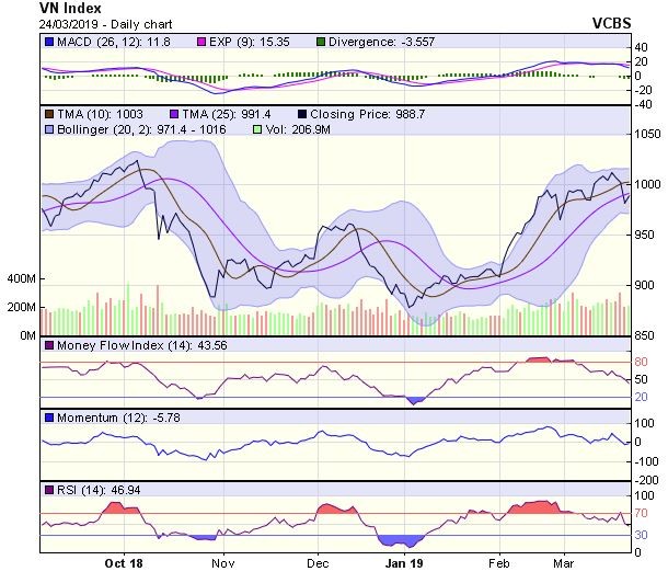 Thêm vào đó, các chỉ báo kỹ thuật khác như MACD và RSI đang cho tín hiệu đi xuống tiêu cực, cho thấy chỉ số có thể vẫn có rủi ro giảm điểm trở lại xuống thử thách vùng hỗ trợ 960-965 điểm (vùng đỉnh tháng 12/2018 và đáy tháng 2/2019) trong những phiên tới.