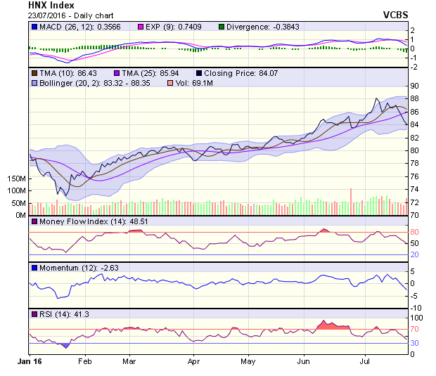 HNX-Index hình thành cây nến đỏ, thân nến dài giảm xuống dưới dải upper bollinger, bóng nến dưới chạm MA100 và bật lên. RSI cắt xuống đường 70, xu hướng ngắn hạn không được tích cực, tuy nhiên về trung hạn, xu hướng tăng vẫn đang khá vững. Thanh khoản duy trì ở mức thấp sau tuần giao dịch. Vùng hỗ trợ 83 điểm. Vùng kháng cự 85 điểm.
