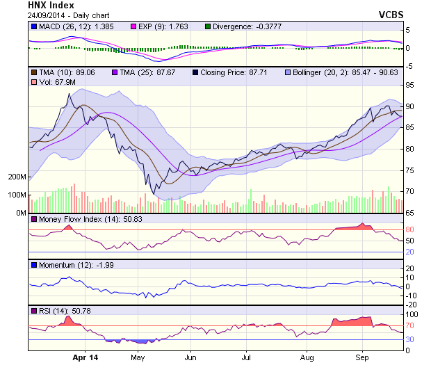 Cùng với dải Bollinger không ngừng thu hẹp lại, các tín hiệu kỹ thuật cũng chưa phát ra tín hiệu khả quan hơn các phiên trước. Theo đó, đà giảm điểm chưa thể chấm dứt trong ngắn hạn, HNX-Index sẽ dao động quanh vùng 87 điểm trong các phiên cuối tuần.