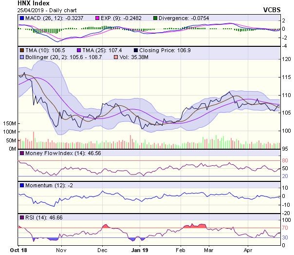 HNX-Index có một diễn biến tương tự. Chỉ số có phiên giảm điểm trở lại khi tiệm cận vùng kháng cự MA20, cho thấy áp lực điều chỉnh ngắn hạn có thể vẫn còn. Trong trường hợp, chỉ số tiếp tục suy yếu thì ngưỡng 105,7 điểm (MA100) có thể là vùng hỗ trợ mạnh.