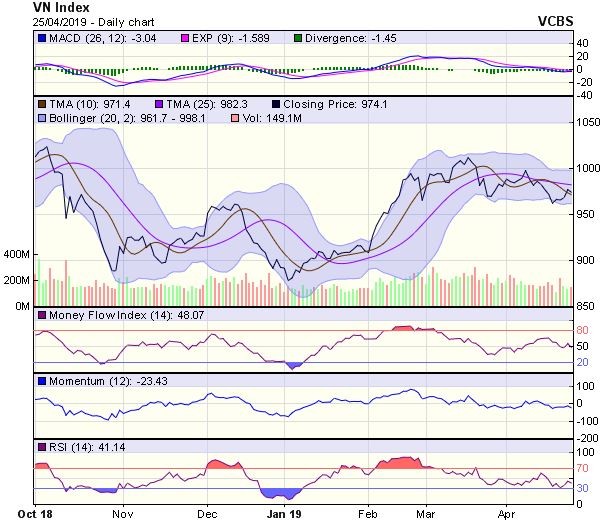 Vùng 980-983 sẽ là vùng cản tiếp theo đối với xu hướng hồi phục của thị trường do đây là vùng hội tụ của đường SMA20, SMA50 và sự hiện diện của khoảng trống từ đợt giảm điểm hồi 25/03/2019.
