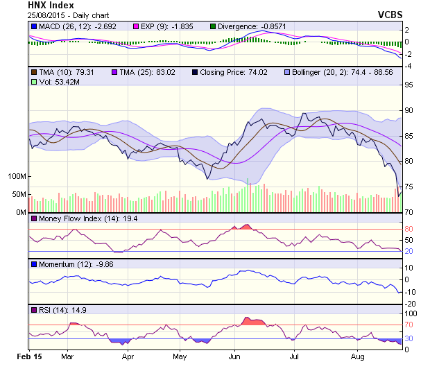 Đồ thị HNX-Index phá vỡ đáy cũ được thiết lập từ tháng 5/2015 (tương đương vùng 76.5-77.5 điểm) sau phiên giảm mạnh trước đó. Vùng này sẽ trở thành vùng kháng cự nếu HNX-Index tiếp tục xu hướng hồi phục trong các phiên tới. Mốc 72 điểm sẽ là mốc hỗ trợ trong ngắn hạn đối với chỉ số này. Các chỉ báo kỹ thuật cho tín hiệu tích cực trở lại khi RSI tăng từ vùng quá bán, trong khi stochastic cũng dần tăng trở lại sau giai đoạn đi ngang tại vùng quá bán.