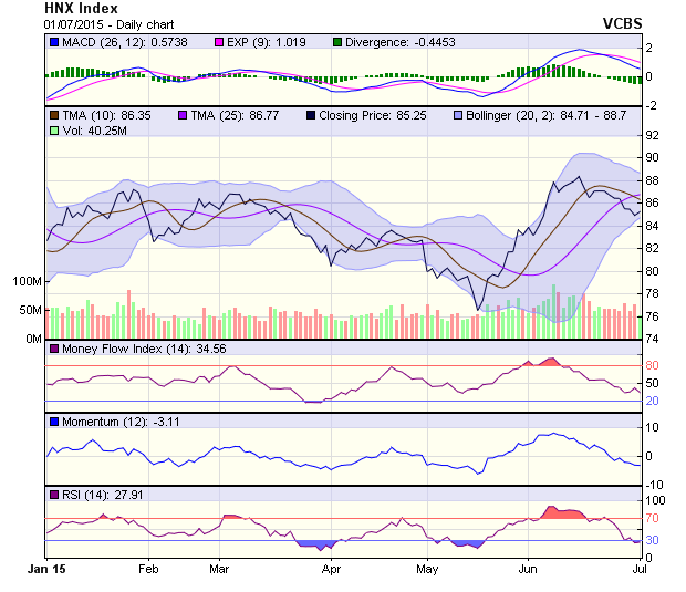 Đồ thị chỉ số HNX-Index tạo thành một Doji với đuôi nến khá dài và tiếp tục duy trì tại đường SMA200 cho thấy mốc hỗ trợ cứng này chưa bị phá vỡ. Các chỉ báo kỹ thuật vẫn cho tín hiệu điều chỉnh giảm. RSI có dấu hiệu đi ngang sau giai đoạn dài điều chỉnh trong khi MACD vẫn chưa có tín hiệu hồi phục sau giai đoạn dài giảm điểm.