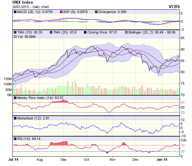 Trên sàn HNX, các đường RSI và MACD vẫn thể hiện sự lạc quan đối với khả năng tiếp diễn xu hướng tăng điểm tuy nhiên việc HNX-Index tiếp cận mốc 87 điểm trong thời gian ngắn khiến cho dải bollinger mở rộng không theo kịp với diễn biến giá, điều này dẫn đến khả năng của một vài phiên điều chỉnh nhằm đưa chỉ số về khu vực biến động ổn định hơn.