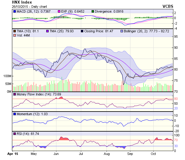 HNX-Index cũng suy yếu nhẹ trở lại. Chỉ số này đang gặp ngưỡng kháng cự khá mạnh tại vùng 82-83 điểm do hội tụ các đường SMA trung và dài hạn. Các chỉ báo kỹ thuật cũng đang cho các tín hiệu kém tích cực khi MACD cắt xuống trở lại đường tín hiệu và chỉ số Band%B đang tiếp tục suy yếu tạo thành phân kỳ với giá. Nếu tiếp tục suy yếu, vùng 80-80.5 điểm sẽ là vùng hỗ trợ trong ngắn hạn cho HNX-Index.