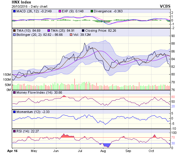 HNX-Index kết phiên với cây nến đỏ dài có bóng trên và dưới tương đương cho thấy sự giằng co trong phiên giữa người mua và bán là khá mạnh mẽ. Chỉ số đóng cửa ở dưới đường MA5 (83,4 điểm) và MA10 (84,4 điểm) nên tín hiệu trong ngắn hạn là tiêu cực. Chỉ số kết phiên ở dưới đường MA20 (84,7 điểm) và MA50 (84 điểm) nên xu hướng trong trung hạn vẫn là tiêu cực. Dự báo xu hướng của HNX-Index trong phiên 27/10 có thể là giảm điểm để kiểm tra mốc hỗ trợ 81,7 điểm, Nếu mốc hỗ trợ được giữ vững thì chỉ số sẽ tiếp tục dao động trong khoảng 81,7-83,4 điểm.