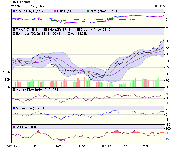 HNX-Index tiếp tục tăng điểm tuần thứ 5 liên tiếp, với mức tăng là khá ấn tượng, đồng thời thanh khoản cũng được cải thiện. Tín hiệu kỹ thuật trong trung hạn tiếp tục là tích cực, với hỗ trợ gần nhất tại 88,2 điểm (MA5) và kháng cự tiếp theo tại 91,4 điểm (đỉnh tháng 10/2014).