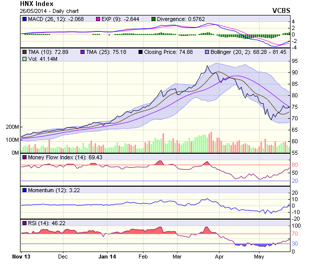 Cùng chung diễn biến, HNX-Index phiên 26/5 cũng tăng nhẹ 0,30 điểm lên đóng cửa tại 74,88 điểm. Tâm lý e dè của nhà đầu tư vẫn khá rõ khi chỉ số dao động hẹp phía trên ngưỡng 74 điểm và thanh khoản cũng có sụt giảm mạnh. Các chỉ báo kỹ thuật vẫn chưa cho tín hiệu quá rõ rệt.