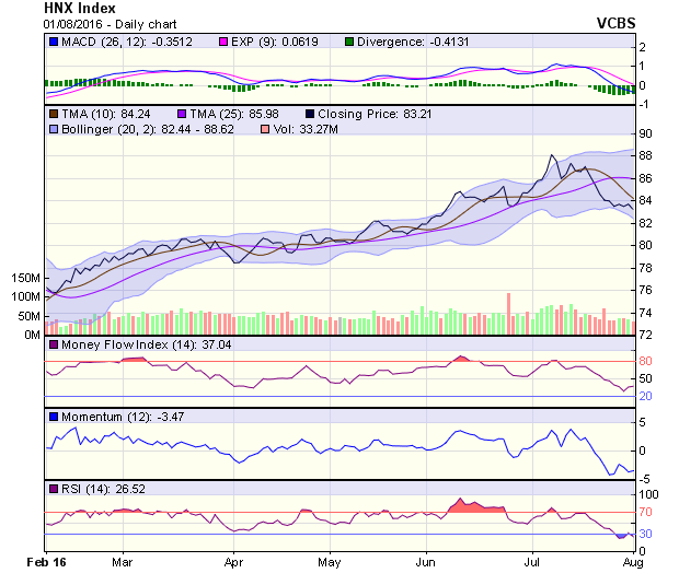 HNX-Index hình thành cây nến đỏ đặc với thân nến dài. Thanh khoản sụt giảm so với các phiên trước. Dải bollinger bands hiện vẫn cho xu hướng mở rộng. Đường giá hiện nằm ngay dưới đường MA50. RSI đang nằm trong vùng oversold. MACD vẫn cho tín hiệu suy yếu dưới đường 0. Vùng hỗ trợ 83 điểm.