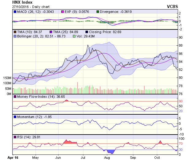 HNX-Index kết phiên với cây nến xanh có chân nến thể hiện lực cầu ở vùng giá thấp đã nâng đỡ chỉ số trong phiên. Chỉ số đóng cửa ở dưới đường MA5 và MA10 nên tín hiệu trong ngắn hạn là tiêu cực, với kháng cự tại 83 điểm. Chỉ số kết phiên ở dưới đường MA20 và MA50 nên xu hướng trong trung hạn vẫn là tiêu cực, với kháng cự tại 84,2 điểm. Dự báo xu hướng của HNX-Index trong phiên 28/10 có thể là tăng điểm để thử thách lại mốc kháng cự trong ngắn hạn tại 83 điểm. Nếu thành công, chỉ số sẽ dao động trong khoảng 83-84 điểm.