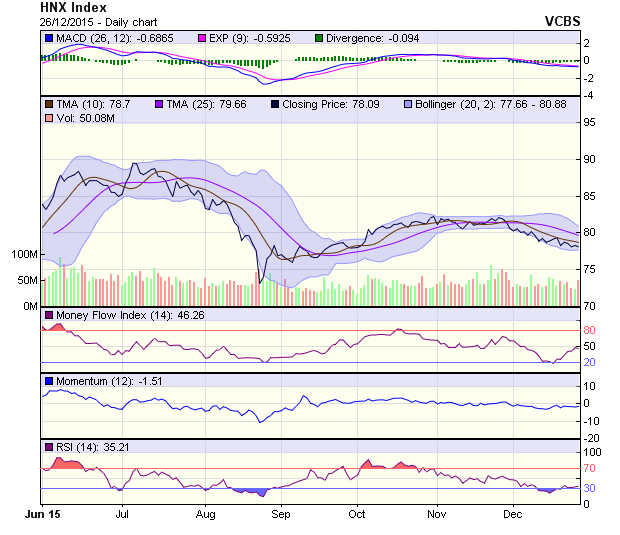 Trên đồ thị, hình mẫu nến của phiên 25/12 cho thấy, trạng thái giằng co giữa mua và bán vẫn tiếp diễn bởi VN-Index đang tiếp cận với đường biên trên của kênh giá giảm kéo dài từ tháng 11/2015 đến nay. Dòng tiền giao dịch trong phiên đã tăng trở lại, nhưng vẫn còn thấp dưới mức bình quân 22 phiên gần nhất (91.7 triệu cổ phiếu).