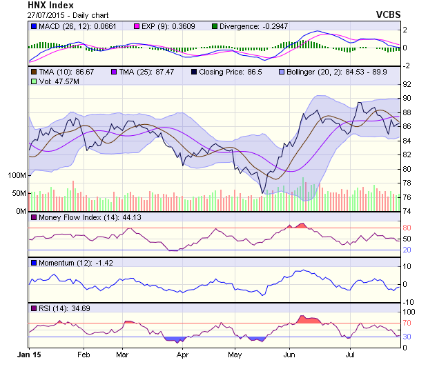 Xét ngưỡng cản trên của HNX-Index tại mốc 87 điểm, có thể thấy rằng sự hiện diện của MA 20 trong khu vực này cùng diễn biến lình xình co hẹp dần là tín hiệu không mấy tích cực cảnh báo về khả năng áp lực bán có thể tái diễn đưa chỉ số một lần nữa lùi về cận dưới của bollinger bands (khu vực 84 - 85 điểm). Trong khi đó, chiều hướng dao động của nhóm các chỉ báo chủ chốt cũng nghiêng về kịch bản điều chỉnh . Cụ thể, đường MACD phân kỳ âm đang lùi về sát mốc giá trị 0 cùng dao động của RSI vẫn đang củng cố cho phân kỳ giá xuống ghi nhận qua các đỉnh ngày 15/6 và 6/7/2015.