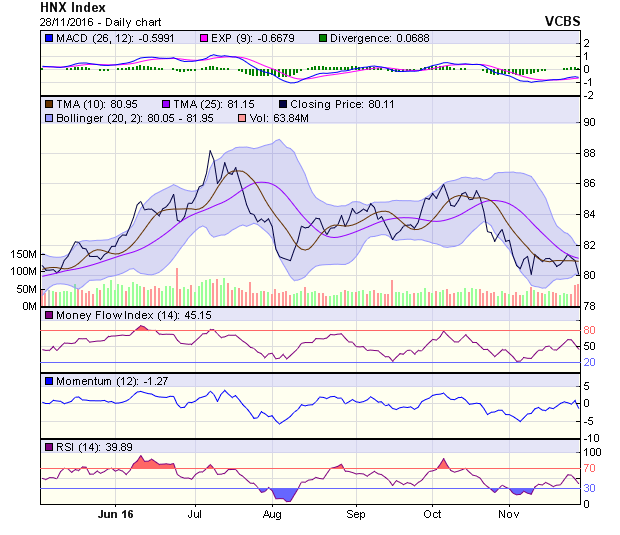 HNX-Index giảm điểm mạnh, tạo thành một nến đỏ lớn rất bearish. Với phiên giảm này, tín hiệu trong ngắn hạn của chỉ số chuyển sang tiêu cực, với kháng cự tại 80,9 điểm (MA5-10). Xu hướng trong trung hạn là tiêu cực với kháng cự tại 81,1 điểm (MA20). HNX-Index tiếp tục ở trong thị trường giá xuống (bear market), với kháng cự tại MA200 ở mức 82,3 điểm. Dự đoán, xu hướng trong phiên 29/11, HNX-Index có thể hồi phục nhẹ về phía mốc kháng cự gần nhất tại 80,9 điểm.