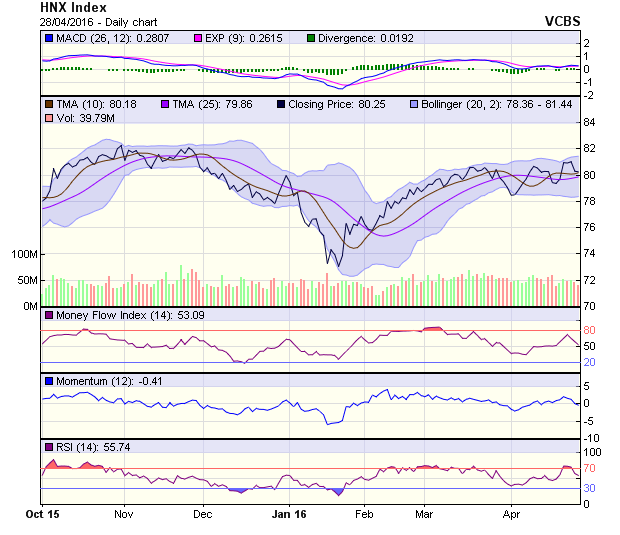 HNX-Index điều chỉnh nhẹ về gần mốc 80 điểm. Trạng thái giằng co diễn ra khá mạnh tại ngưỡng này. Thanh khoản sụt giảm nhẹ so với 1 vài phiên gần đây. Ngắn hạn, chỉ số được hỗ trợ bởi đường MA20, RSI và MACD cũng cho tín hiệu suy yếu trong ngắn hạn.