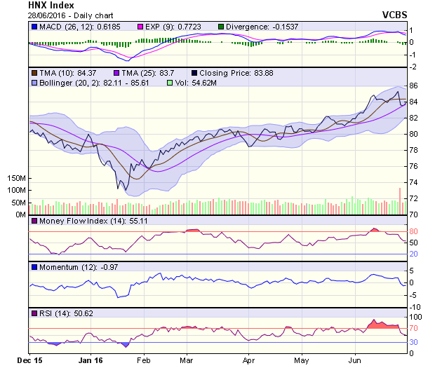 HNX-Index hình thành cây nến xanh rỗng với bóng nến dưới dài. Đường giá hiện đang bám trên dải middle bollinger. Thanh khoản có sự cải thiện nhẹ. RSI , MACD hiện chưa cho tín hiệu rõ ràng trở lại. Vùng hỗ trợ 82 điểm. Vùng kháng cự 84 điểm.
