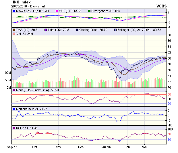 HNX-Index quay đầu giảm điểm xuống dưới ngưỡng 80 điểm khi áp lực bán quay trở lại. Đường MA200, tương đương với mức 80,81 điểm đang trở thành ngưỡng kháng cự mạnh và khó vượt trong ngắn hạn của chỉ số. Một số chỉ báo như RSI, MACD tiếp tục cho tín hiệu đi xuống trong ngắn hạn. Theo đó, chỉ số sẽ tiếp tục giằng co quanh vùng này trong nhiều phiên tới trước khi xác lập lại xu thế tăng.
