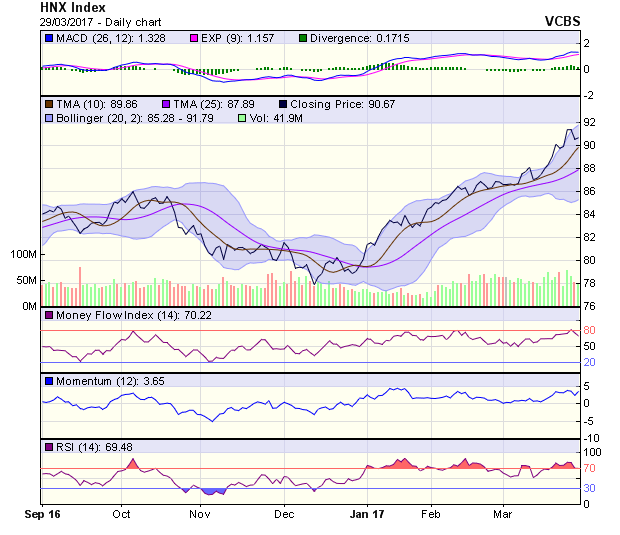 HNX-Index cũng hồi phục nhẹ trở lại sau phiên điều chỉnh 28/3. Tín hiệu kỹ thuật trong ngắn hạn tiếp tục là trung tính, với hỗ trợ gần nhất tại 89,9 điểm (MA10) và kháng cự gần nhất tại 90,8 điểm (MA5). Tín hiệu kỹ thuật trong trung hạn duy trì tích cực, với hỗ trợ gần nhất tại 88,5 điểm (MA20).