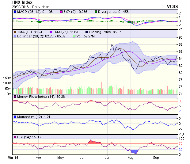 HNX-Index kết phiên với cây nến xanh dài thể hiện lực mua mạnh của nhà đầu tư trong cả phiên giao dịch. ADX đang có xu hướng đi lên. MACD và Stochastic đều cho tín hiệu tích cực lên chỉ số. Mốc hỗ trợ gần nhất cho chỉ số tại 84,8 điểm. Theo đó, HNX-Index những phiên tới sẽ giao dịch tích cực để hướng đến mốc kháng cự gần nhất là 85,9 điểm.